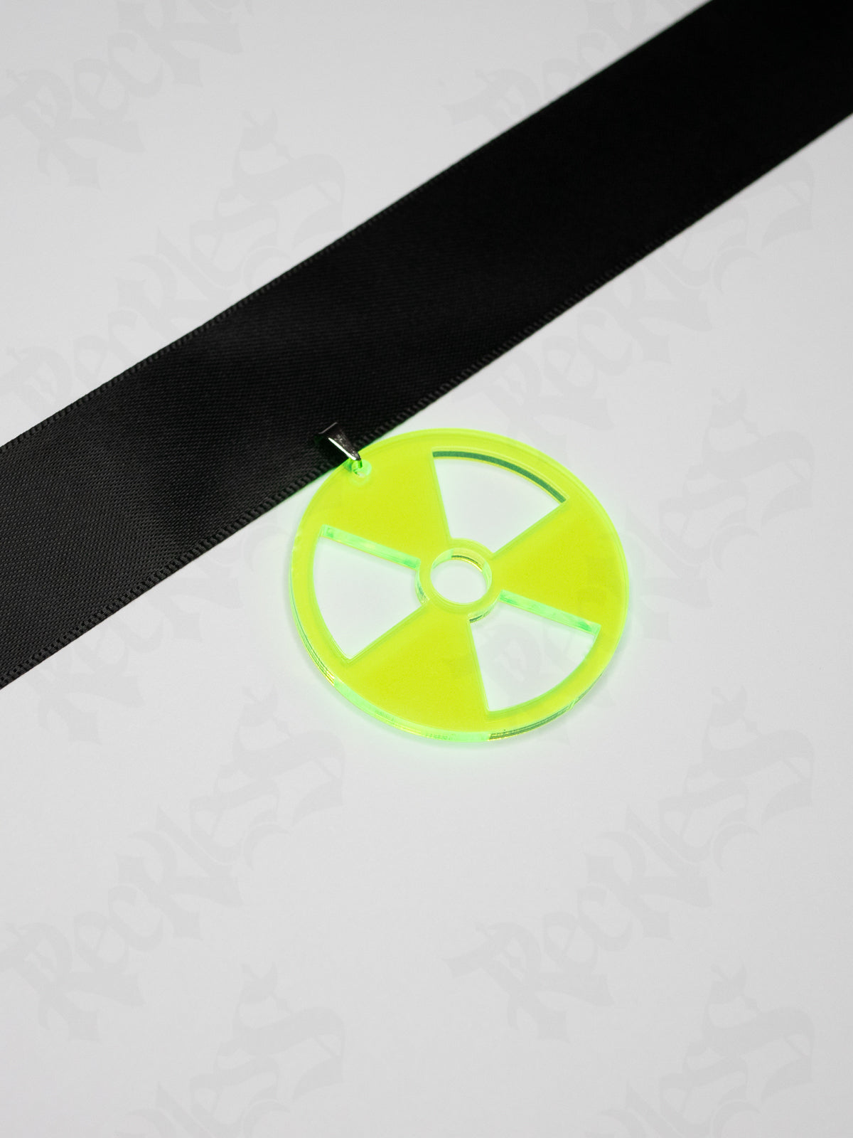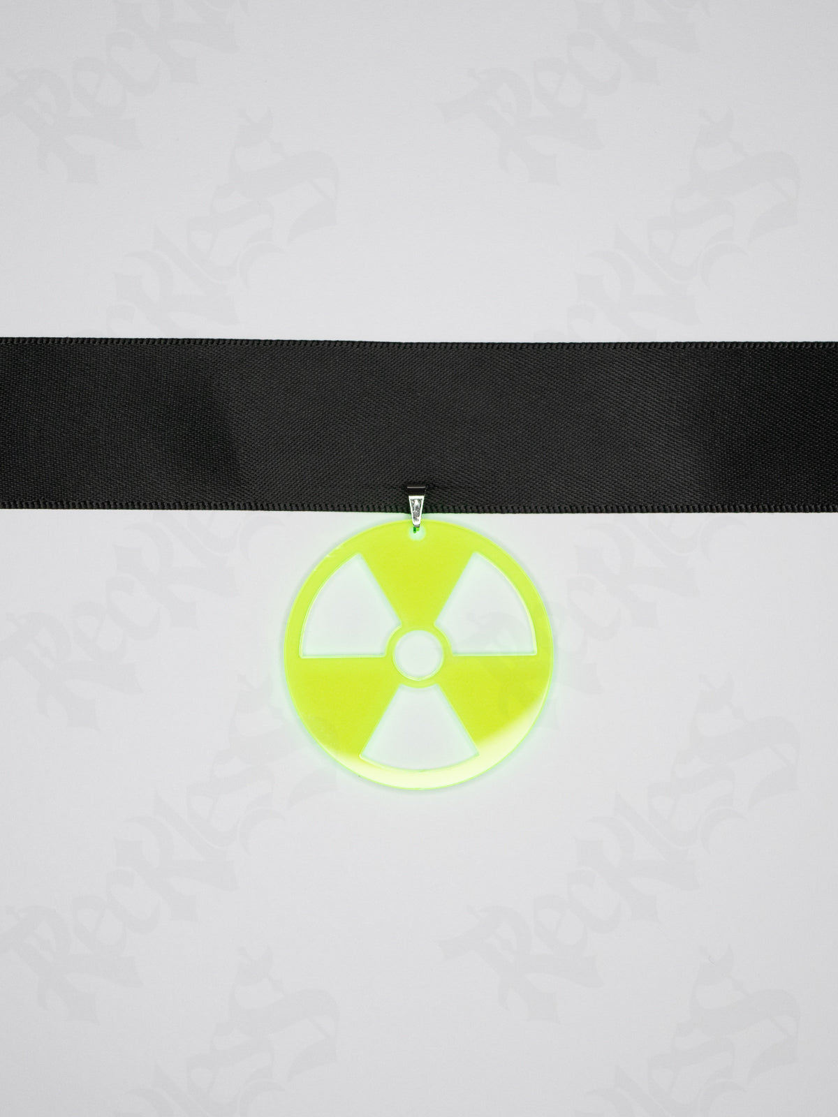 Affirmez votre style avec ce magnifique ras-de-cou orné d'un pendentif Radioactif en acrylique de 4 cm. Le satin noir sublimera à merveille votre allure audacieuse.